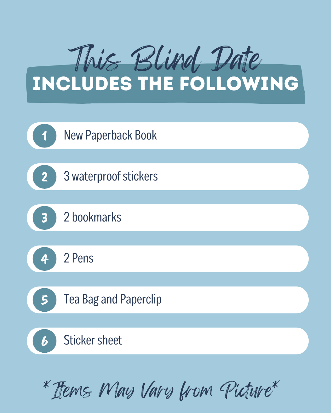 Includes: Paperback book, 2 pens, 2 bookmarks, sticker sheet OR Post its OR page tabs, 3 waterproof stickers, tea bag, and paperclip - items may vary from pictured